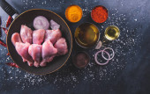 Widok góry nogi indyka na patelni z przyprawami na czarny stół