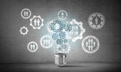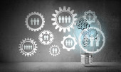 Zdjęcie "Żarówka z wielu szkicowany biegów wewnątrz umieszczona struktury społecznej biegu na szarej ścianie. renderowania 3D." może być wykorzystywane do celów osobistych i komercyjnych zgodnie z warunkami zakupionej licencji Royalty-free. Obraz jest dostępny do pobrania w jakości wysokiej rozdzielczości do 5760x3840.