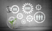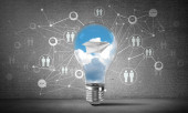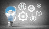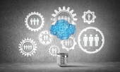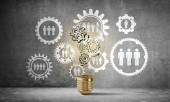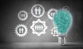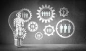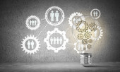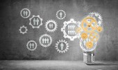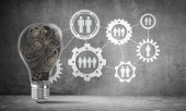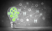 Żarówka z wielu szkicowany biegów wewnątrz umieszczona struktury społecznej biegu na szarej ścianie. renderowania 3D.
