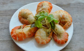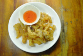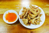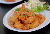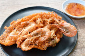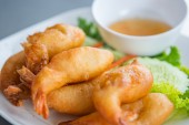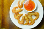 chrupiące krewetki smażone z mąki organizowanie i słodkim sosem na talerzu