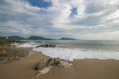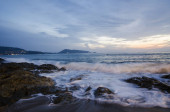 Pięknej piaszczystej plaży z soft fali hit rock i morze piasek plaża w wieczorne niebo kolorowy zachód słońca.