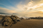 Zdjęcie "Pięknej piaszczystej plaży z soft fali hit rock i morze piasek plaża w wieczorne niebo kolorowy zachód słońca." może być wykorzystywane do celów osobistych i komercyjnych zgodnie z warunkami zakupionej licencji Royalty-free. Obraz jest dostępny do pobrania w jakości wysokiej rozdzielczości do 5760x3840.