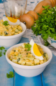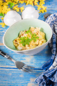 Sałatka z pieczone ziemniaki, ogórek kiszony, jajko i wędzone Turcja na świąteczny stół w stylu rustykalnym. Góry wyświetlić tło płaskie świeckich.