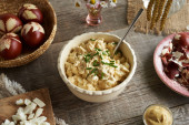 Zdjęcie "Sałatka z pieczone ziemniaki, ogórek kiszony, jajko i wędzone Turcja na świąteczny stół w stylu rustykalnym. Góry wyświetlić tło płaskie świeckich. " może być wykorzystywane do celów osobistych i komercyjnych zgodnie z warunkami zakupionej licencji Royalty-free. Obraz jest dostępny do pobrania w jakości wysokiej rozdzielczości do 5760x3840.