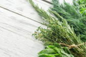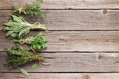 Inne bukiety świeże zioła na niebieskim tle drewnianych.