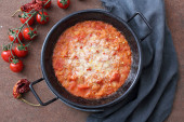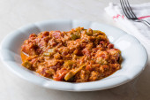serwowane cardon karczochy w sosie pomidorowym na talerzu widelcem na drewnianym stole, widok z góry