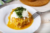 Leniwy Gołąbki na drewnianym stole. Pyszny domowy obiad.