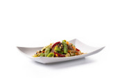 Ciepły, słodki Sałatka z plastry pieczonego kurczaka, warzywa i ananasa na białym tle. Danie główne Salat z smażony filet z indyka, pomidory, ogórki, awokado w eleganckiej restauracji płyta