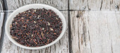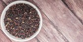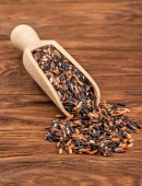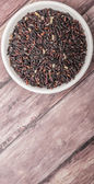 Rozproszone dziki ryż czarny szklany słoik na drewniane tło zbliżenie