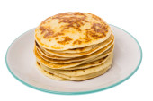 Stos złotych naleśniki na talerzu biały siedzi na stole w kuchni czeka do spożycia