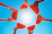 Dziewczyna w stroju kąpielowym z arbuza w rękę i czerwone tło z nasion