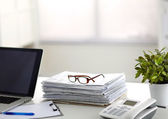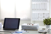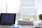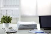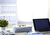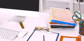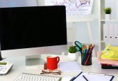 Obszar roboczy Prezentacja makiety, komputer stacjonarny i office supp