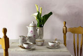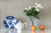 Składu porcelany biały czajnik, białe kwiaty bzu i dwie pomarańcze - tło, kuchnia, elegancki wystrój wnętrz