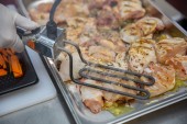 Zdjęcie "Kucharz jest umieszczenie gorący grilla kukurydza kolby w zasobniku srebrny wyświetlacz na imprezę." może być wykorzystywane do celów osobistych i komercyjnych zgodnie z warunkami zakupionej licencji Royalty-free. Obraz jest dostępny do pobrania w jakości wysokiej rozdzielczości do 5760x3840.