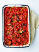 zbliżenie na tacy z Bliskiego Wschodu duszony bakłażan