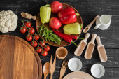 Świeże sezonowe warzywa organiczne, składniki sztućce i serwetka kuchnia sprawdzane na jasnym tle rustykalnym, widok z góry, ramki. Zdrowego odżywiania lub czyste jedzenie koncepcja.