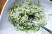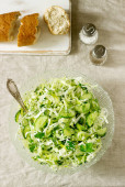 Sałatka jarzynowa świeżej kapusty, ogórków i cebuli z natką pietruszki i koperkiem. Styl rustykalny, Selektywny fokus.