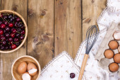 Przygotowanie domu słodkie wypieki z wiśniami. Jaj, mąki i jagody na tle drewnianych. Posiekane jajko drewniane miski. Miejsce