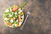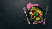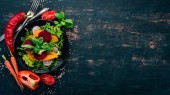 Sałatka z buraków świeżych, pomidorów i sałaty. Zdrowe jedzenie. Na czarny drewniany stół. Widok z góry. Ilość wolnego miejsca dla tekstu.