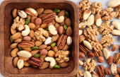 Różne rodzaje orzechów w drewniane miski. Zdrowa żywność.
