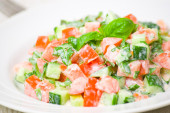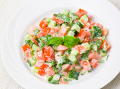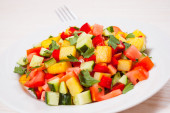 sałatką ze świeżych warzyw z pomidora, ogórka i zielonej cebuli w biały talerz na czarnym tle.