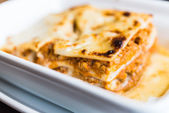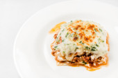 Włoski lasagne bolognese mięsa mielonego, marchew i ser parmezan w piękny niebieski płytki ceramicznej. Miejsce, Selektywny fokus