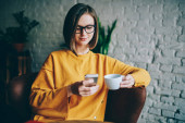 Zdjęcie "Wesoły marzycielski kreatywnego projektanta zastanawiając się na nowych, kreatywnych pomysłów na rozwijanie własnej strony internetowej w czasie rekreacji w kawiarni. Uśmiechnięte dziewczyny hipster zadumany śmiech z śmieszne sms" może być wykorzystywane do celów osobistych i komercyjnych zgodnie z warunkami zakupionej licencji Royalty-free. Obraz jest dostępny do pobrania w jakości wysokiej rozdzielczości do 5760x3840.