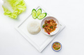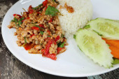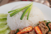 Tajskie jedzenie pikantne, smażone wieprzowina z bazylią