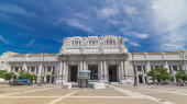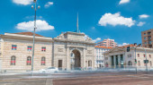 Stary pomnik Porta Garibaldi arch timelapse hyperlapse i nowoczesnych budynków Porta Garibaldi w Mediolanie. Ruch na drodze. Błękitne niebo chmury w letni dzień