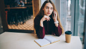 Młody uroczy szczęśliwy hipster dziewczyna cieszy rekreacja pomieszczeniu podczas rozmowy na telefon komórkowy podłączony do Internetu. Dobry wygląd Blondynka kobieta spędzania wolnego czasu z nowoczesnych urządzeń i literatury
