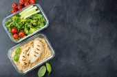 Zdrowy posiłek prep pojemniki z quinoa, pierś z kurczaka i zieloną sałatą strzał głową. Widok z góry. Leżał z płaskim.