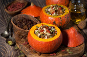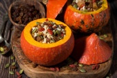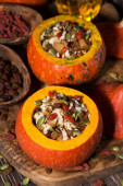 ryż z suszonych owoców w dyni na drewnianym stole, zbliżenie, poziome