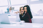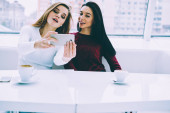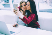 Urocza brunetka i atrakcyjny blond kobieta zastanawiając się podczas zakupów w sklepie internetowym ulubione produkty na telefon. Dziewczyn młodych cute hipster komunikują się ze sobą podczas siedzący w pomieszczeniu