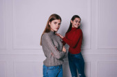 Połowie długości portret przepiękny pozytywne blogerów, patrząc na kamery podczas komunikowania się między sobą o nowe pomysły i ulepszenia dla osobiste strony internetowe podczas siedząc w kawiarni loft