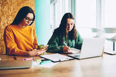 Dwóch młodych projektantów kobiet pracujących razem nad nowym projektem, siedząc przy laptopie. Smart studentów spisywać planowania w notebook dla organizacji seminarium siedzący w bibliotece