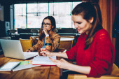 Zdjęcie "Dwóch młodych projektantów kobiet pracujących razem nad nowym projektem, siedząc przy laptopie. Smart studentów spisywać planowania w notebook dla organizacji seminarium siedzący w bibliotece" może być wykorzystywane do celów osobistych i komercyjnych zgodnie z warunkami zakupionej licencji Royalty-free. Obraz jest dostępny do pobrania w jakości wysokiej rozdzielczości do 5760x3840.