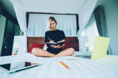 Zdjęcie "Zamyślony, młoda kobieta, wybór przedmiotów w sklepie sieci web na komputerze przenośnym, Dokonywanie zakupów, relaksując się w łóżku, kobiece pracujesz zdalnie w weekend w hotelu aktualizowanie treści na blogu za pomocą panelu dotykowego" może być wykorzystywane do celów osobistych i komercyjnych zgodnie z warunkami zakupionej licencji Royalty-free. Obraz jest dostępny do pobrania w jakości wysokiej rozdzielczości do 5760x3840.