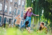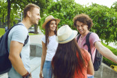 Grupa studentów wieloetnicznym z plecakami spaceru w parku