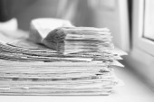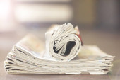 Kupie składany i walcowane, gazety i wiele monet, widok z boku