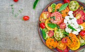 Sałatka z pomidorów z cebuli i bazylii pesto na białym tle drewnianych, widok z góry z miejsca kopii