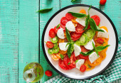 Zdjęcie "Sałatka z pomidorów z cebuli i bazylii pesto na białym tle drewnianych, widok z góry z miejsca kopii" może być wykorzystywane do celów osobistych i komercyjnych zgodnie z warunkami zakupionej licencji Royalty-free. Obraz jest dostępny do pobrania w jakości wysokiej rozdzielczości do 5760x3840.