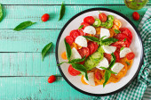 Zdjęcie "Kolorowy pomidor sałatka z pesto cebuli i bazylii. Wegańskie. Widok z góry. Leżał z płaskim" może być wykorzystywane do celów osobistych i komercyjnych zgodnie z warunkami zakupionej licencji Royalty-free. Obraz jest dostępny do pobrania w jakości wysokiej rozdzielczości do 5760x3840.
