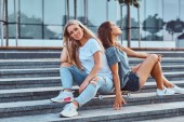 Portret dwóch dziewcząt młodych hipster siedzieli na deskorolce kroki na tle drapacza chmur.