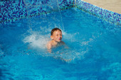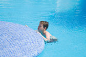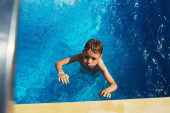 Szczęśliwe dziecko grając w błękitną wodą basen na tropikalny ośrodek nad morzem. Koncepcja lato wakacje. Pływanie w basenie woda ładny chłopiec. Dziecko, przelewanie i zabawy w basenie