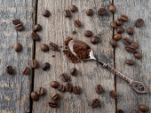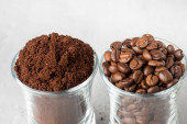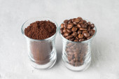 Dwa kubki szklane z ziaren kawy i zmielonej kawy na jasnym tle betonowych.
