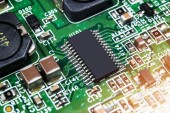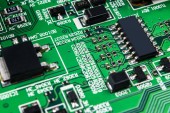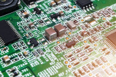Makro ujęcie układu scalonego z rezystorami mikroczipami i komponentami elektronicznymi. Technologia sprzętu komputerowego. Zintegrowany procesor komunikacyjny. Inżynieria informacji. Półprzewodnik. Płytka drukowana. Zbliżenie