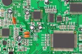 Makro ujęcie układu scalonego z rezystorami mikroczipami i komponentami elektronicznymi. Technologia sprzętu komputerowego. Zintegrowany procesor komunikacyjny. Inżynieria informacji. Półprzewodnik. Płytka drukowana. Zbliżenie