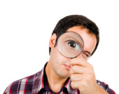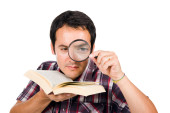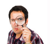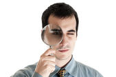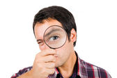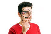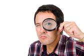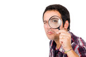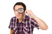 młody mężczyzna patrząc przez szkło powiększające, na białym tle