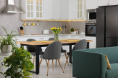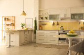 Zdjęcie "Stylowy apartament wnętrza z meblami kuchennymi i sofą" może być wykorzystywane do celów osobistych i komercyjnych zgodnie z warunkami zakupionej licencji Royalty-free. Obraz jest dostępny do pobrania w jakości wysokiej rozdzielczości do 5760x3840.