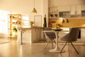 Stylowy apartament wnętrza z meblami kuchennymi i sofą